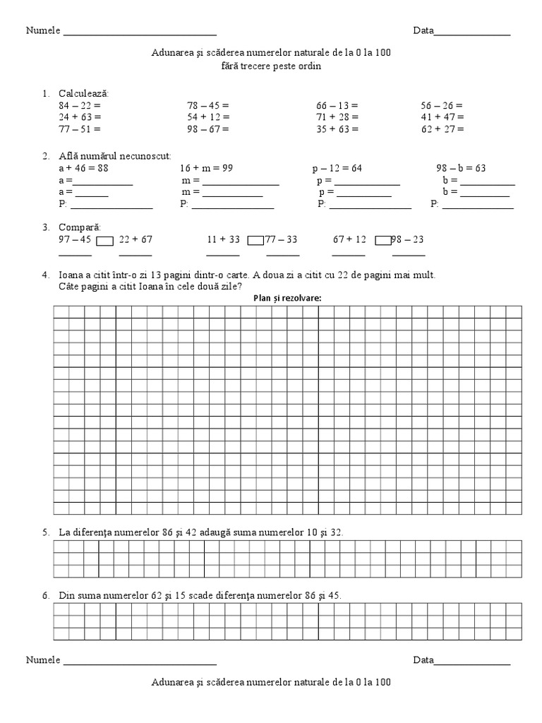 Adunarea Si Scaderea Numerelor Naturale De La 0 La 100 Fara Trecere Peste Ordin