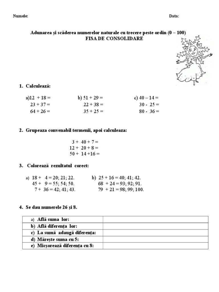 Fise De Lucru Clasa 1 Matematica Adunare Si Scadere Cu Trecere Peste Ordin
