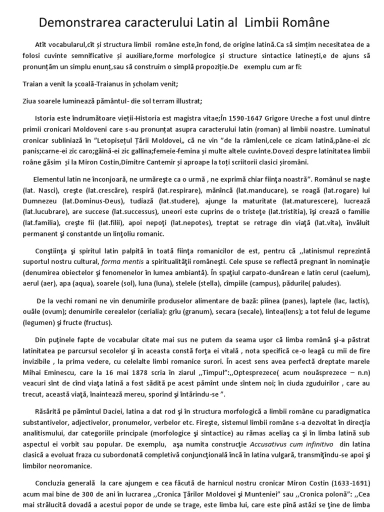 Demonstrarea Caracterului Latin Al Limbii Romane