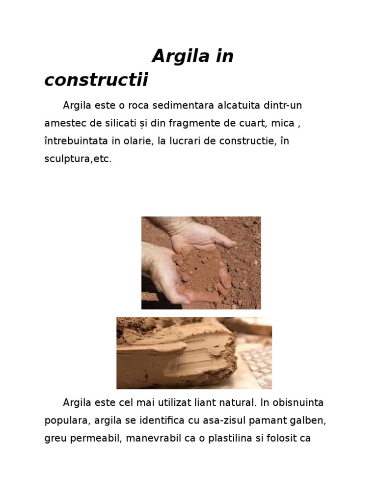 Argila buna grasa untoasa se aseaza pe fundul paharului incet in timp ce argila saraca in minerale de calitate proasta se lasa la fundul paharului repede. Se gaseste sub diverse sortimente. Argila alba galbena rosie verde si gri cea mai buna in sensul continutului de informatii si energii benefice fiind cea galbena are cel mai mare continut de fier magneziu si calciu urmata de argila alba. Terapia cu argilă are efecte metabolice puternice este un detoxifiant şi un mineralizant pentru organism.