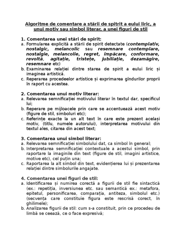 Algoritme De Comentare A Stării De Spitrit A Eului Liric A Unui Motiv Sau Simbol Literar A Unei Figuri De Stil