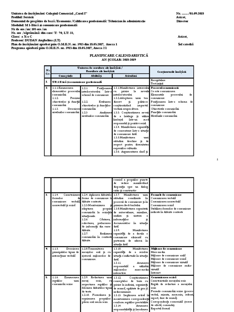 Planificare Calendaristica Etica Si Comunicare Profesionala Cls 10 Elena Z2012 25 09 2017