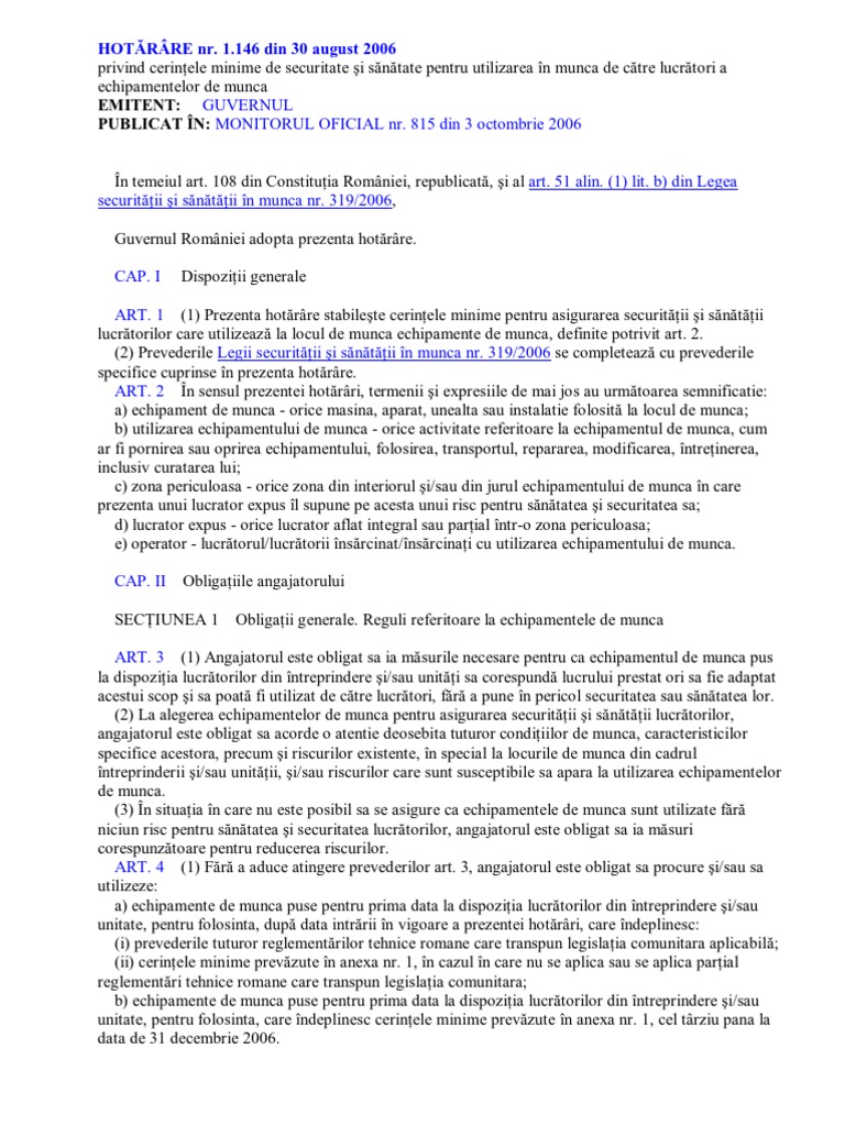 Hg 1146 Din 30 08 2006 Privind Cerintele Minime S S Pt Utilizarea De Catre Lucratori A Echipamentelor De Munca