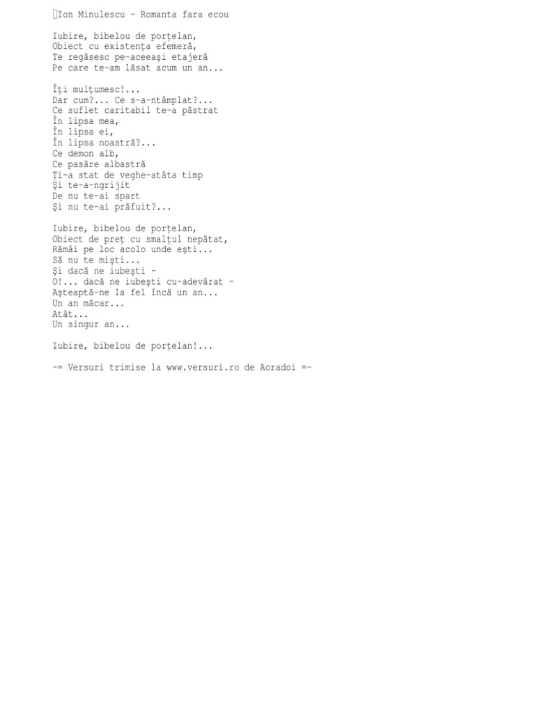 Romanță Fără Ecou De Ion Minulescu Yorick