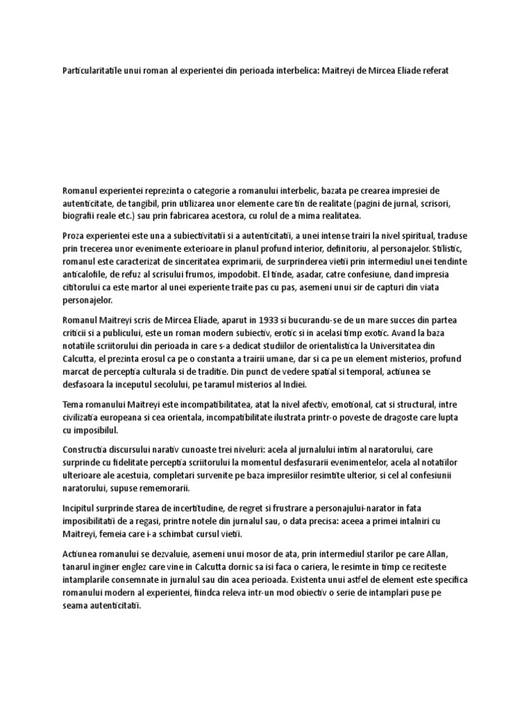 Particularitatile Unui Roman Al Experientei Din Perioada Interbelica Maitreyi De Mircea Eliade