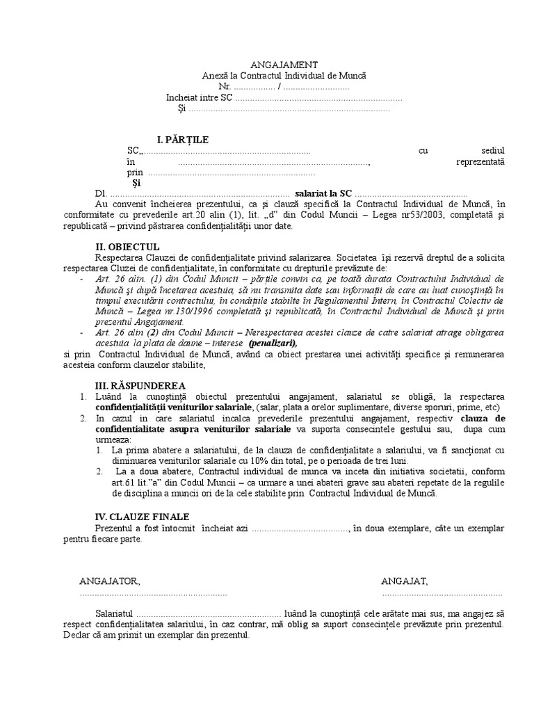 Angajament De Confidentialitate Model
