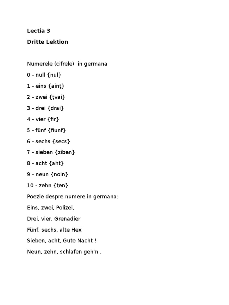 O femeie are părul blond 2 zwei propozitii. 1 eins propozitii. 3 trei three. Numerele de la unu la douasprezece sunt simple si pot fi invatate pe de rost ele stand la baza exprimarii numerelor mai mari.