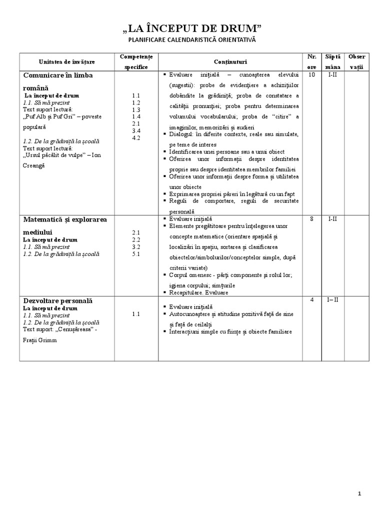 Planificare Pe Unitati De Invatare Clasa Pregatitoare Sem I 1