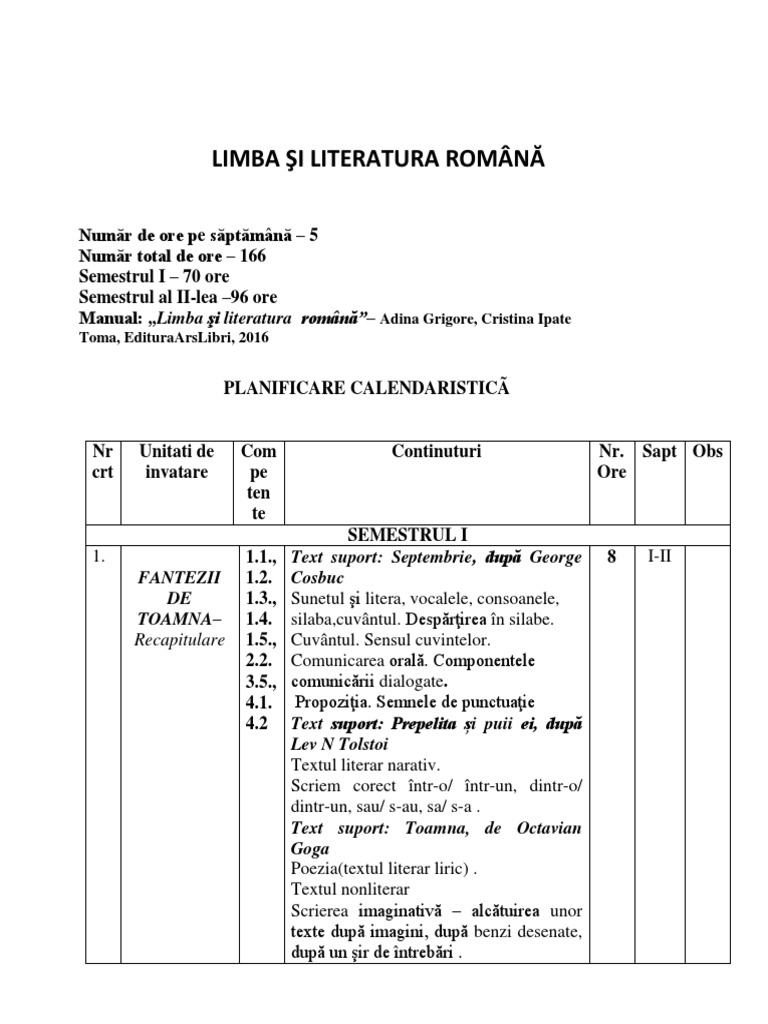 Proiectarea Unitatilor De Invatare La Limba Si Literatura Romana