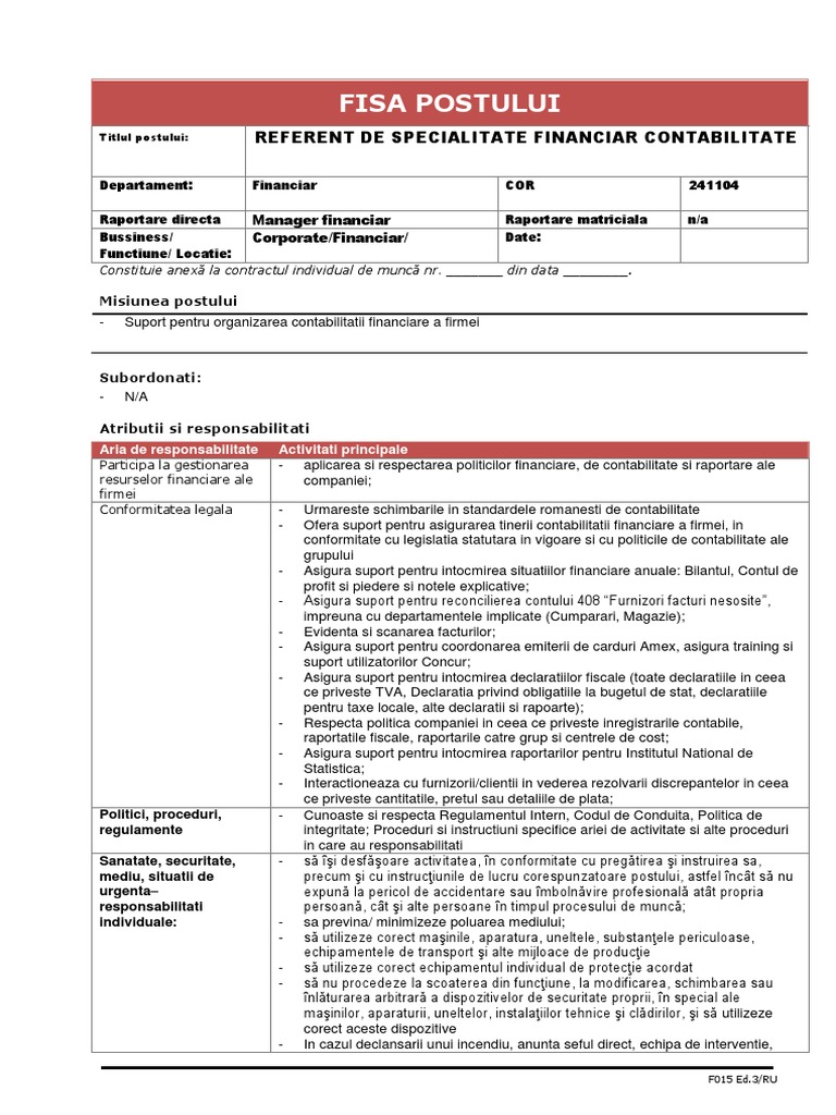 Fisa Postului Referent De Specialitate Financiar Contabilitate