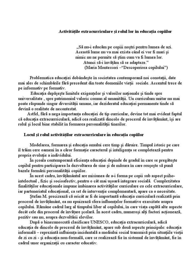 Locul Si Rolul Activităţilor Extracurriculare In Educaţia Copiilor