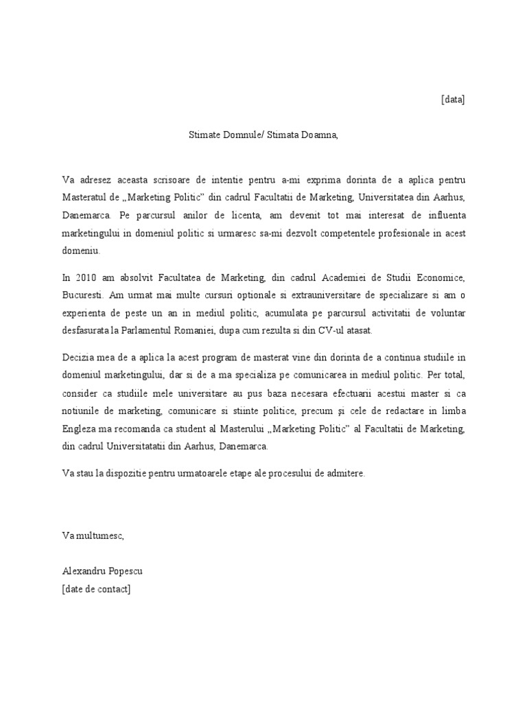 Model Scrisoare De Intentie Pentru Masterat Strainatate