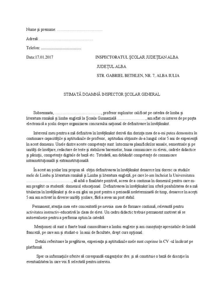 Scrisoare De Intentie Profesor Definitivat